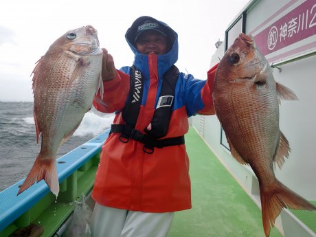 乗合2隻で久里浜沖の30m前後を狙い、連日ヒット多く楽しめています。