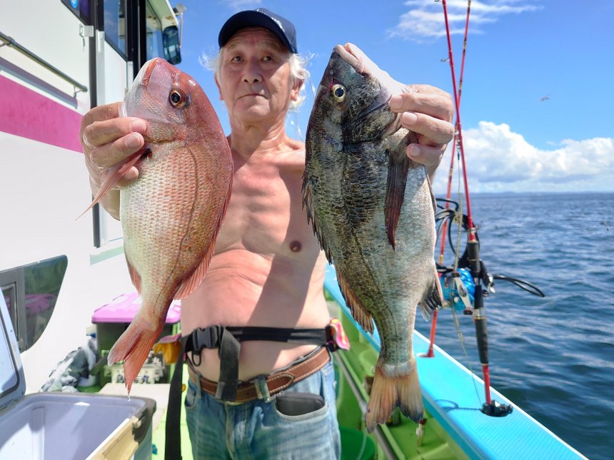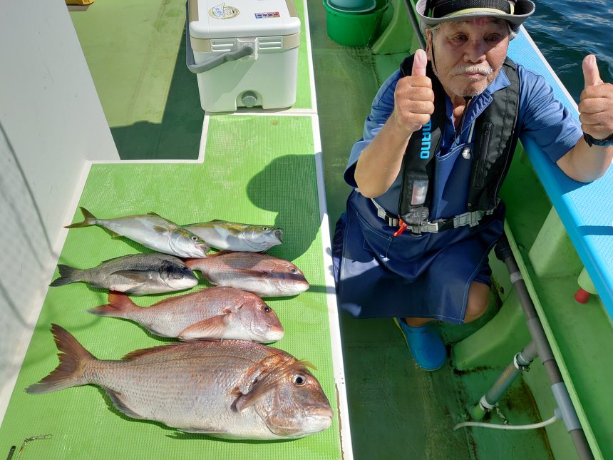 マダイ(最大4.32kg)、クロダイ、ワラサ、ワカシ、大アジ、イサキが釣れて楽しめました。